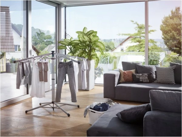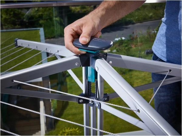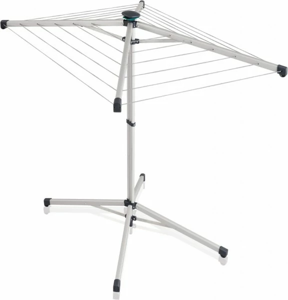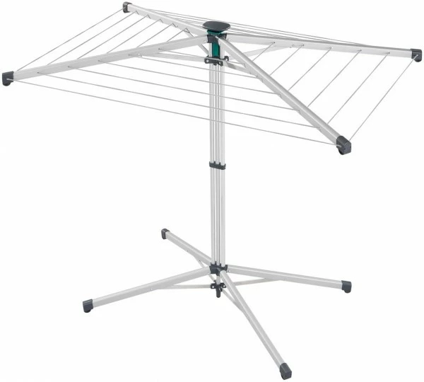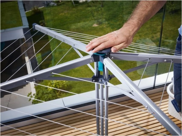 Die Leinen sind von innen nach außen leicht abfallend angeordnet, sodass man problemlos jede Leine erreicht. Mit einer Höhe von 95 cm bietet selbst die äußerste Leine die Möglichkeit lange Wäschestücke wie beispielsweise Badehandtücher oder Hosen zu trocknen. Dabei sorgen die stabilen Leinenarme und die breite Aufstellfläche, auch voll beladen, für einen sicheren Stand. Durch Druck auf den Bediengriff lassen sich die Leinen einfach und bequem nachspannen.