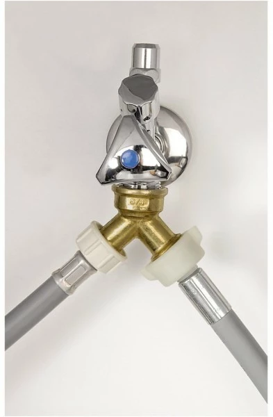 Aus eins mach zwei: An diesen Y-Verteiler können Sie zwei Zulaufschläuche anbringen und so ganz bequem Spülmaschine und Waschmaschine gleichzeitig laufen lassen.